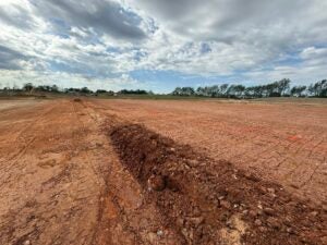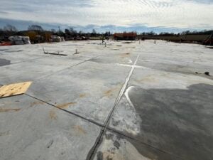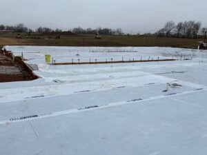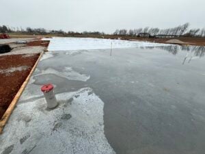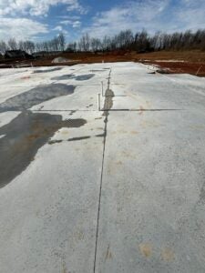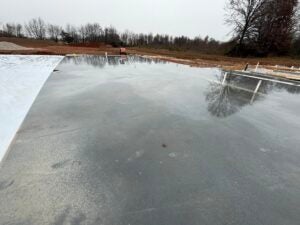 KCI has finished installing the majority of the building slab, with cure sheets on the slab. AT&T was on site lowering their fiber line to avoid a conflict with the fiber and stormwater for the detention basin.