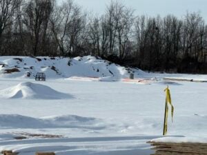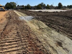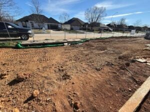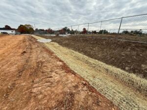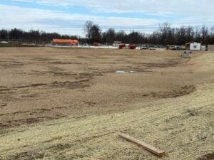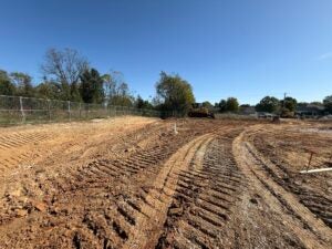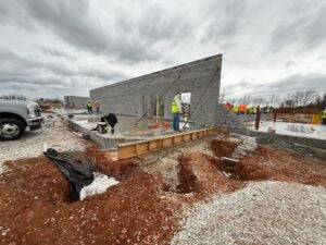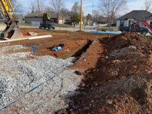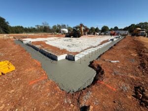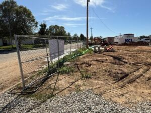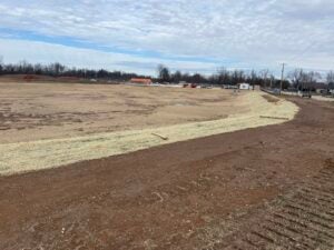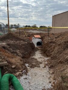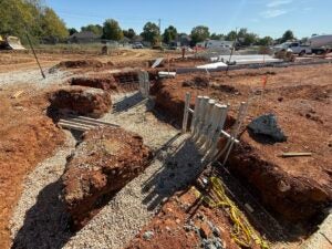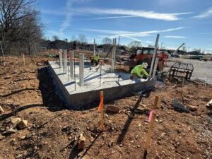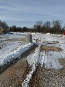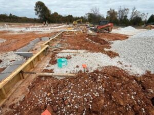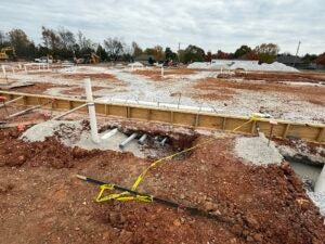 KCI is working on foundation installation, underground plumbing, site utility installation, and berm installation along the detention basin to the south.
