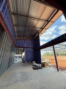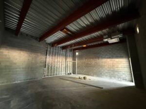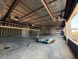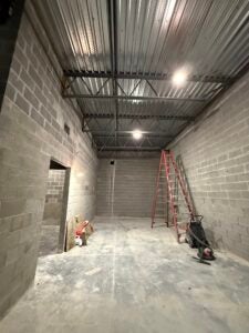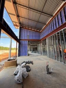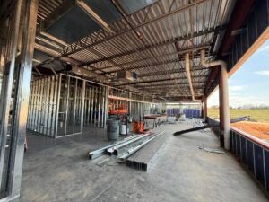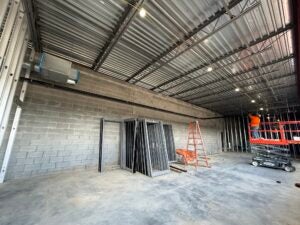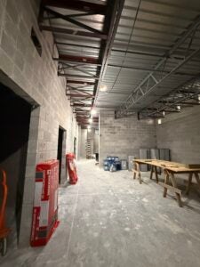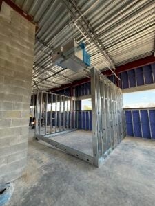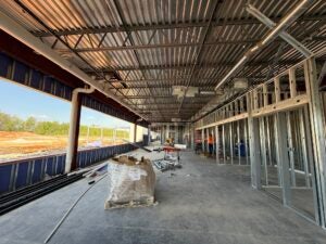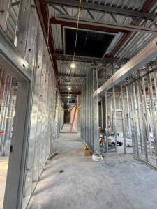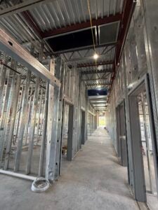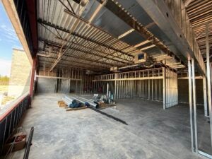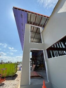 KCI has been working on the roof assembly installation and weather barrier. They’ve also continued with interior and exterior framing, interior door frame installation, and the installation of the overhead mechanical, electrical, and plumbing hangers.