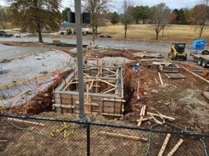 Crews have made progress pouring the concrete for the splash pad and the surge tank walls for the building that will become the pump house for the splash pad. On Monday, they poured the second section of the splash pad. Crews will soon turn their attention to the building which will slow progression as they get into more detailed work with masonry and getting all the plumbing for the internal workings of the building. They are progressing as scheduled even with the much needed rain this week.
